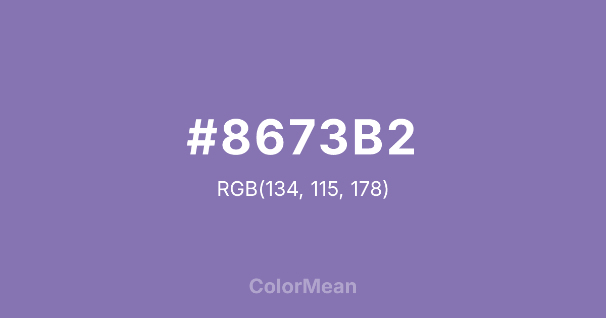 #8673B2 RGB value is (134, 115, 178). The hex color red value is 134, green is 115, and blue is 178. Its HSL format shows a hue of 258°, saturation of 29 percent, and lightness of 57 percent. The CMYK process values are 25 percent, 35 percent, 0 percent, 30 percent.