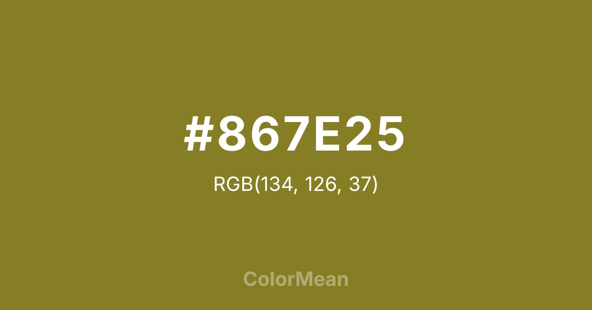 #867E25 RGB value is (134, 126, 37). The hex color red value is 134, green is 126, and blue is 37. Its HSL format shows a hue of 55°, saturation of 57 percent, and lightness of 34 percent. The CMYK process values are 0 percent, 6 percent, 72 percent, 47 percent.