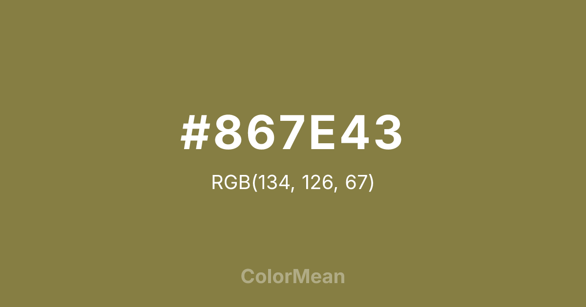 #867E43 RGB value is (134, 126, 67). The hex color red value is 134, green is 126, and blue is 67. Its HSL format shows a hue of 53°, saturation of 33 percent, and lightness of 39 percent. The CMYK process values are 0 percent, 6 percent, 50 percent, 47 percent.