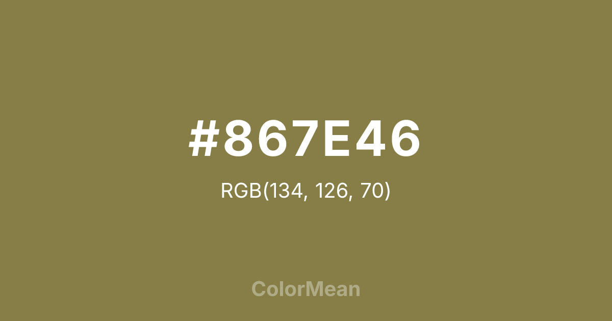 #867E46 RGB value is (134, 126, 70). The hex color red value is 134, green is 126, and blue is 70. Its HSL format shows a hue of 53°, saturation of 31 percent, and lightness of 40 percent. The CMYK process values are 0 percent, 6 percent, 48 percent, 47 percent.