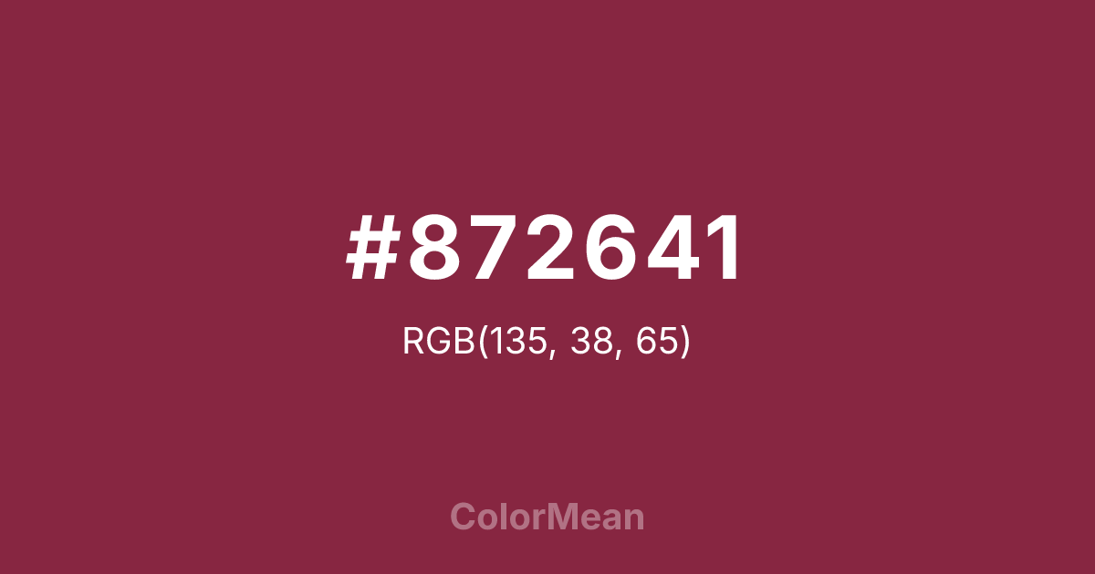#872641 RGB value is (135, 38, 65). The hex color red value is 135, green is 38, and blue is 65. Its HSL format shows a hue of 343°, saturation of 56 percent, and lightness of 34 percent. The CMYK process values are 0 percent, 72 percent, 52 percent, 47 percent.