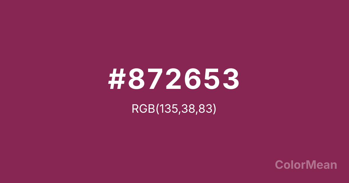 #872653 RGB value is (135, 38, 83). The hex color red value is 135, green is 38, and blue is 83. Its HSL format shows a hue of 332°, saturation of 56 percent, and lightness of 34 percent. The CMYK process values are 0 percent, 72 percent, 39 percent, 47 percent.