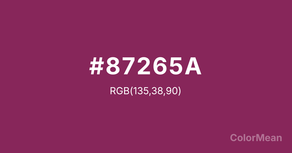 #87265A RGB value is (135, 38, 90). The hex color red value is 135, green is 38, and blue is 90. Its HSL format shows a hue of 328°, saturation of 56 percent, and lightness of 34 percent. The CMYK process values are 0 percent, 72 percent, 33 percent, 47 percent.