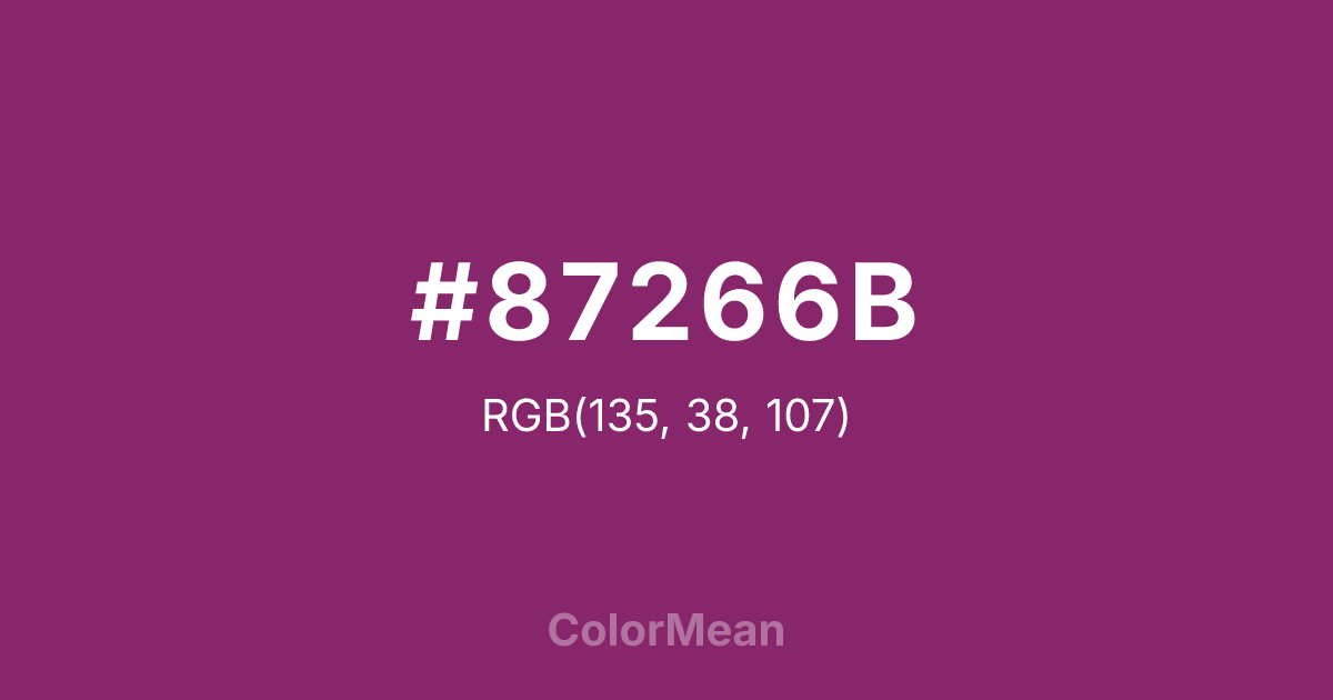 #87266B RGB value is (135, 38, 107). The hex color red value is 135, green is 38, and blue is 107. Its HSL format shows a hue of 317°, saturation of 56 percent, and lightness of 34 percent. The CMYK process values are 0 percent, 72 percent, 21 percent, 47 percent.