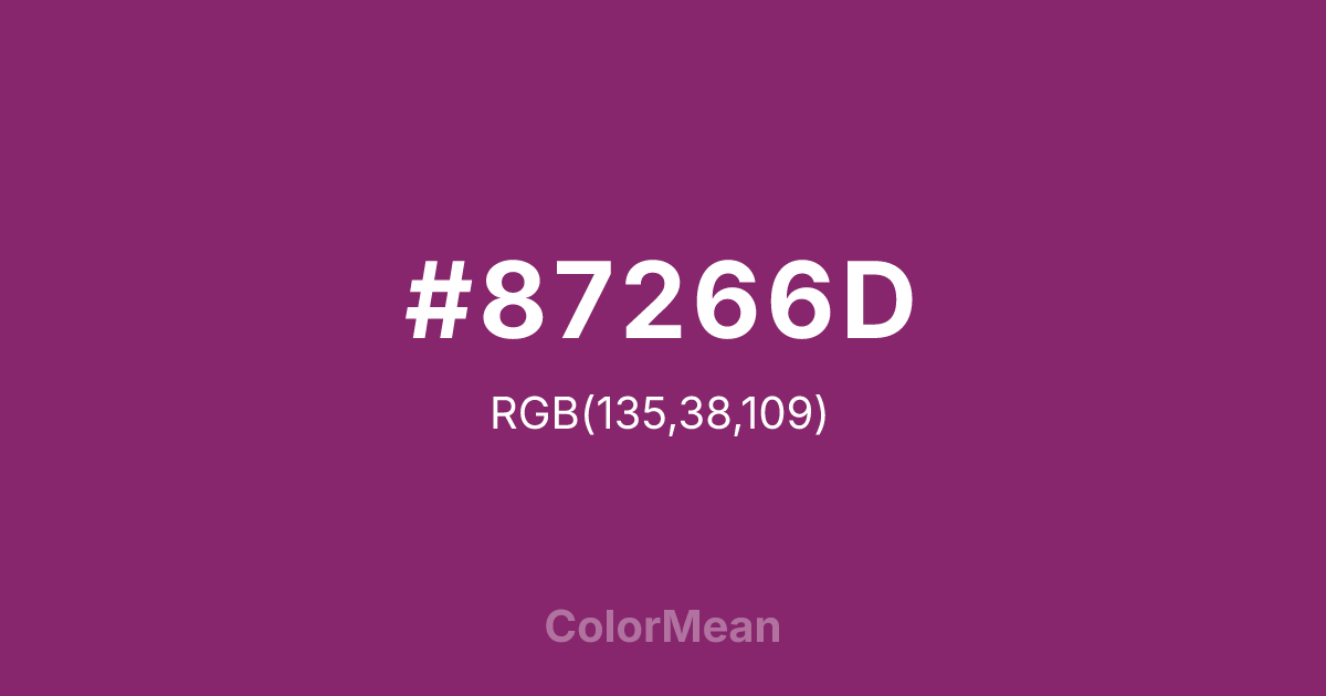 #87266D RGB value is (135, 38, 109). The hex color red value is 135, green is 38, and blue is 109. Its HSL format shows a hue of 316°, saturation of 56 percent, and lightness of 34 percent. The CMYK process values are 0 percent, 72 percent, 19 percent, 47 percent.