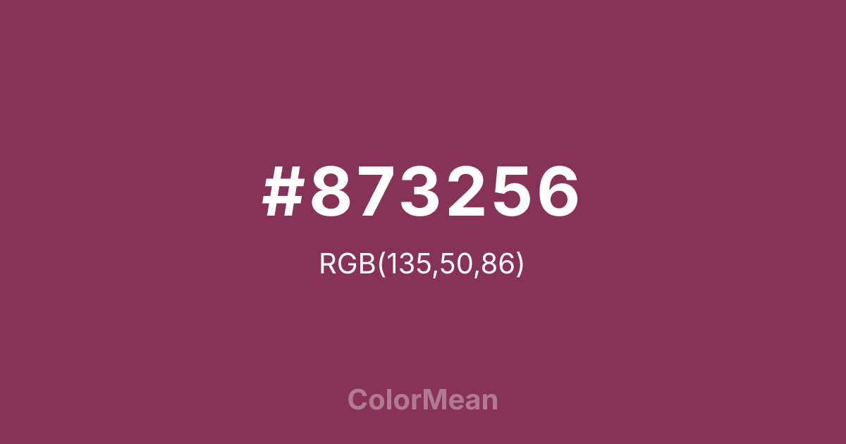 #873256 RGB value is (135, 50, 86). The hex color red value is 135, green is 50, and blue is 86. Its HSL format shows a hue of 335°, saturation of 46 percent, and lightness of 36 percent. The CMYK process values are 0 percent, 63 percent, 36 percent, 47 percent.
