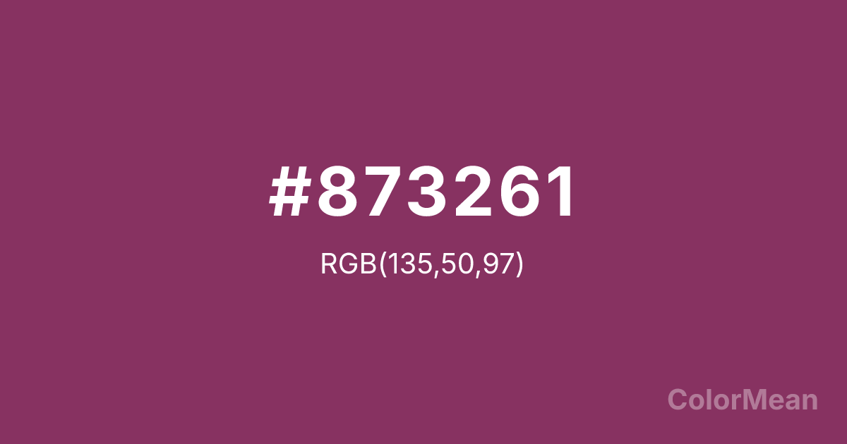 #873261 RGB value is (135, 50, 97). The hex color red value is 135, green is 50, and blue is 97. Its HSL format shows a hue of 327°, saturation of 46 percent, and lightness of 36 percent. The CMYK process values are 0 percent, 63 percent, 28 percent, 47 percent.