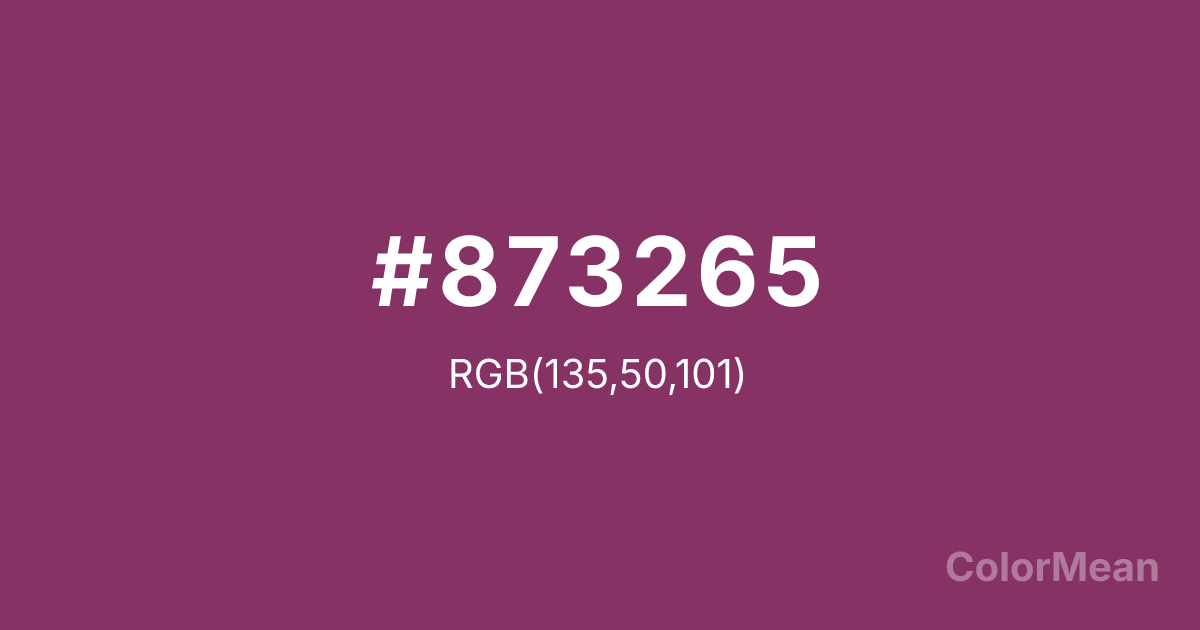 #873265 RGB value is (135, 50, 101). The hex color red value is 135, green is 50, and blue is 101. Its HSL format shows a hue of 324°, saturation of 46 percent, and lightness of 36 percent. The CMYK process values are 0 percent, 63 percent, 25 percent, 47 percent.