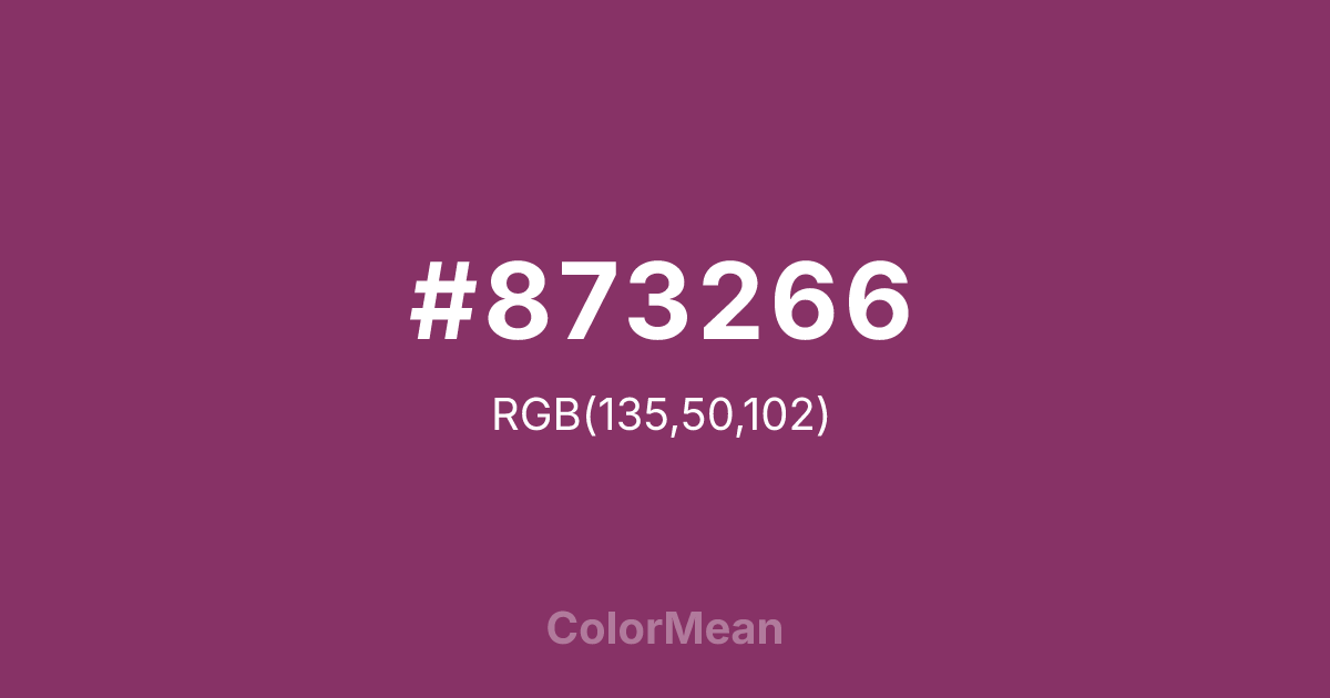 #873266 RGB value is (135, 50, 102). The hex color red value is 135, green is 50, and blue is 102. Its HSL format shows a hue of 323°, saturation of 46 percent, and lightness of 36 percent. The CMYK process values are 0 percent, 63 percent, 24 percent, 47 percent.