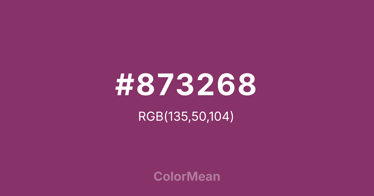 #873268 RGB value is (135, 50, 104). The hex color red value is 135, green is 50, and blue is 104. Its HSL format shows a hue of 322°, saturation of 46 percent, and lightness of 36 percent. The CMYK process values are 0 percent, 63 percent, 23 percent, 47 percent.
