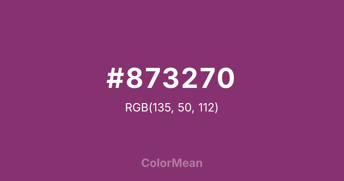 #873270 RGB value is (135, 50, 112). The hex color red value is 135, green is 50, and blue is 112. Its HSL format shows a hue of 316°, saturation of 46 percent, and lightness of 36 percent. The CMYK process values are 0 percent, 63 percent, 17 percent, 47 percent.
