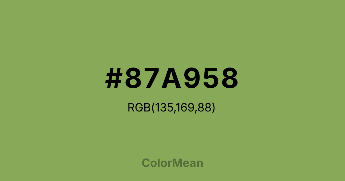 #87A958 RGB value is (135, 169, 88). The hex color red value is 135, green is 169, and blue is 88. Its HSL format shows a hue of 85°, saturation of 32 percent, and lightness of 50 percent. The CMYK process values are 20 percent, 0 percent, 48 percent, 34 percent.