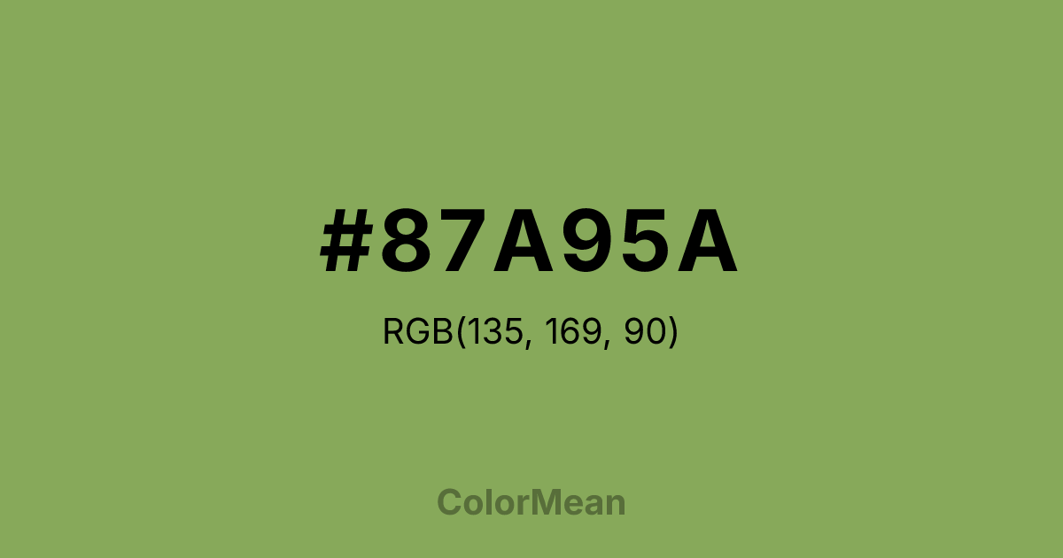#87A95A RGB value is (135, 169, 90). The hex color red value is 135, green is 169, and blue is 90. Its HSL format shows a hue of 86°, saturation of 31 percent, and lightness of 51 percent. The CMYK process values are 20 percent, 0 percent, 47 percent, 34 percent.