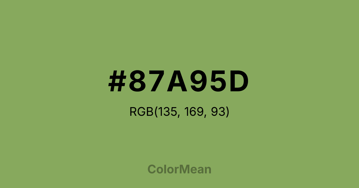 #87A95D RGB value is (135, 169, 93). The hex color red value is 135, green is 169, and blue is 93. Its HSL format shows a hue of 87°, saturation of 31 percent, and lightness of 51 percent. The CMYK process values are 20 percent, 0 percent, 45 percent, 34 percent.