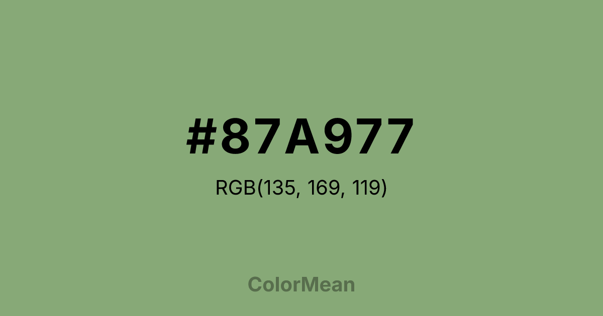 #87A977 RGB value is (135, 169, 119). The hex color red value is 135, green is 169, and blue is 119. Its HSL format shows a hue of 101°, saturation of 23 percent, and lightness of 56 percent. The CMYK process values are 20 percent, 0 percent, 30 percent, 34 percent.