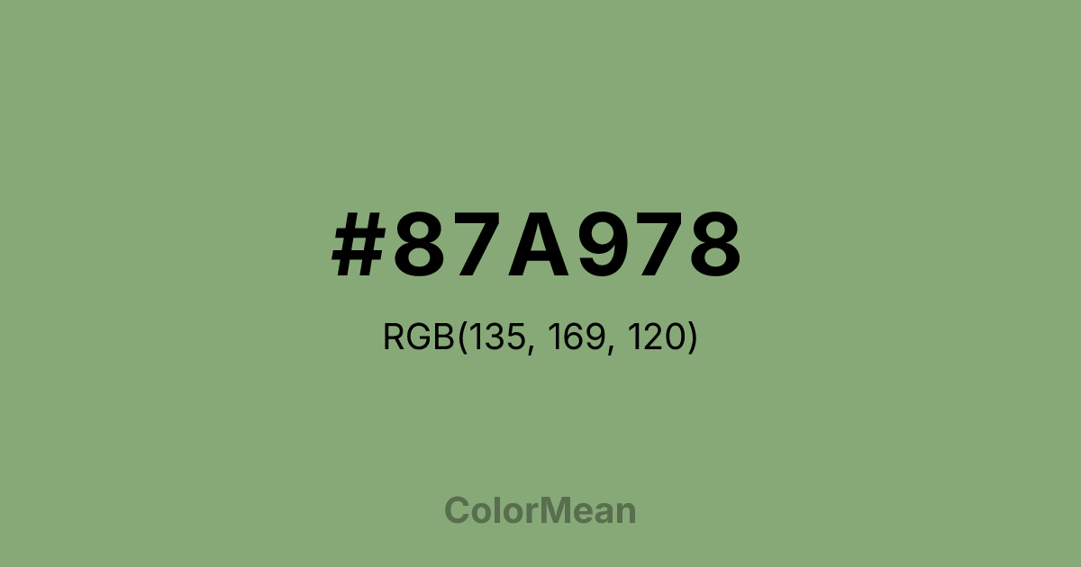 #87A978 RGB value is (135, 169, 120). The hex color red value is 135, green is 169, and blue is 120. Its HSL format shows a hue of 102°, saturation of 22 percent, and lightness of 57 percent. The CMYK process values are 20 percent, 0 percent, 29 percent, 34 percent.