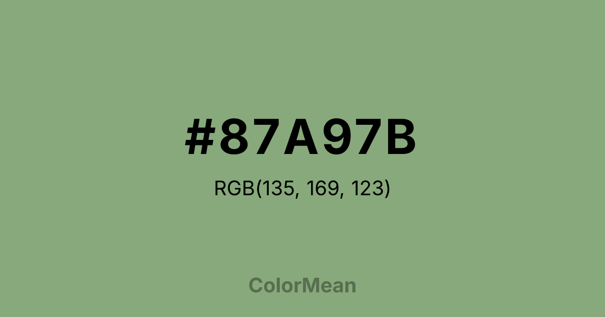 #87A97B RGB value is (135, 169, 123). The hex color red value is 135, green is 169, and blue is 123. Its HSL format shows a hue of 104°, saturation of 21 percent, and lightness of 57 percent. The CMYK process values are 20 percent, 0 percent, 27 percent, 34 percent.