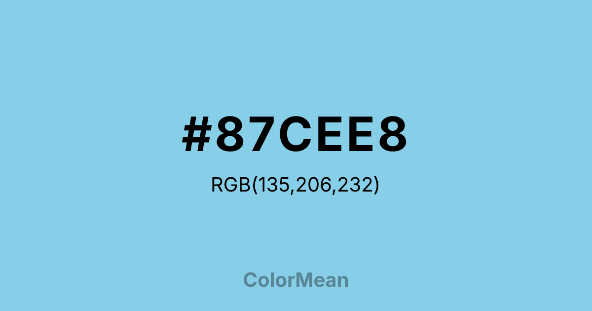 #87CEE8 RGB value is (135, 206, 232). The hex color red value is 135, green is 206, and blue is 232. Its HSL format shows a hue of 196°, saturation of 68 percent, and lightness of 72 percent. The CMYK process values are 42 percent, 11 percent, 0 percent, 9 percent.