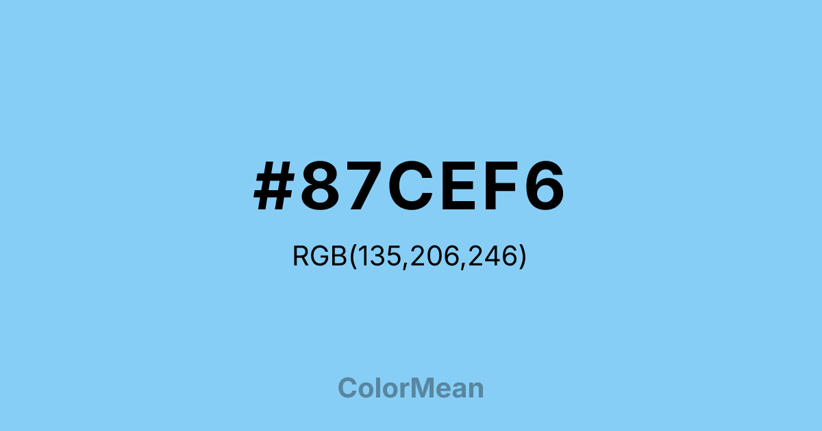 #87CEF6 RGB value is (135, 206, 246). The hex color red value is 135, green is 206, and blue is 246. Its HSL format shows a hue of 202°, saturation of 86 percent, and lightness of 75 percent. The CMYK process values are 45 percent, 16 percent, 0 percent, 4 percent.