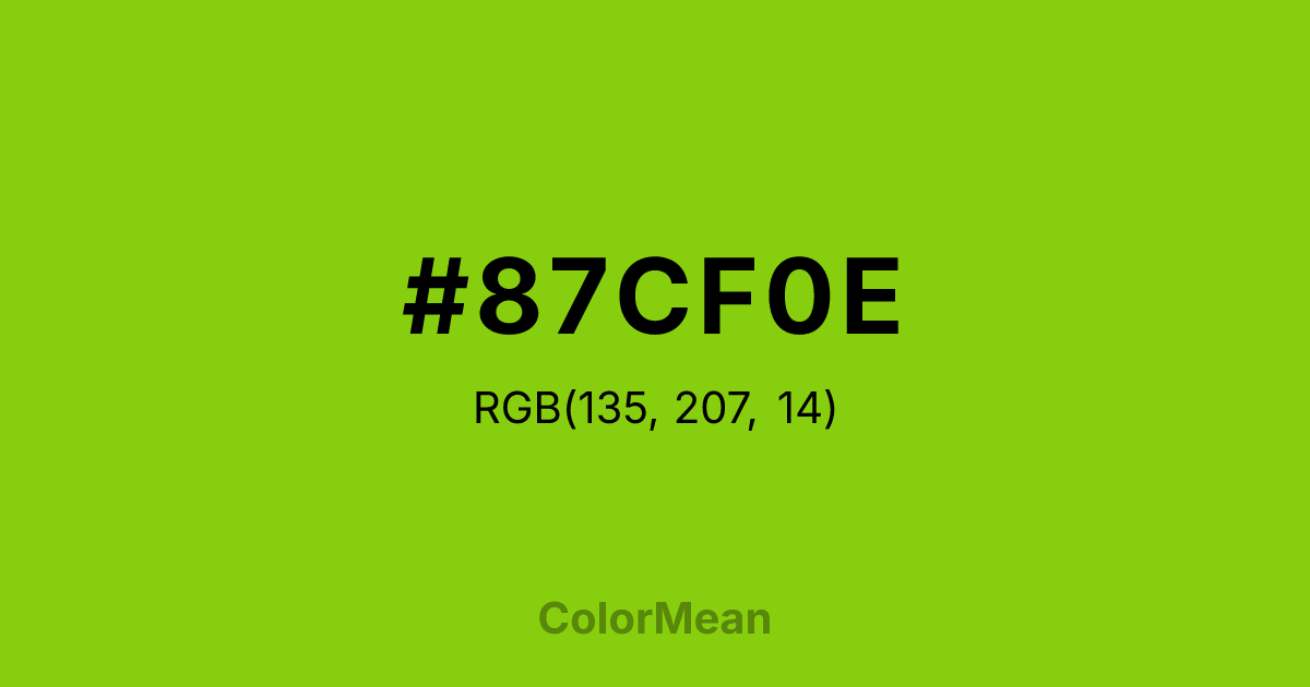 #87CF0E RGB value is (135, 207, 14). The hex color red value is 135, green is 207, and blue is 14. Its HSL format shows a hue of 82°, saturation of 87 percent, and lightness of 43 percent. The CMYK process values are 35 percent, 0 percent, 93 percent, 19 percent.