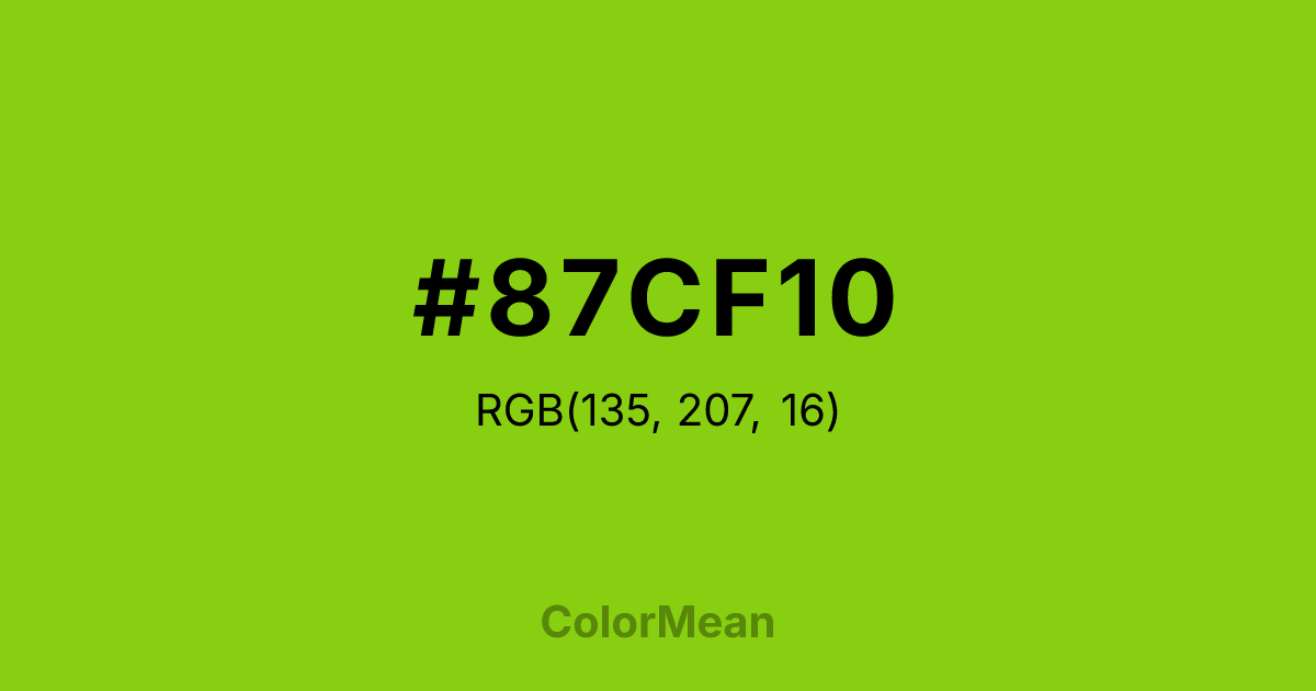 #87CF10 RGB value is (135, 207, 16). The hex color red value is 135, green is 207, and blue is 16. Its HSL format shows a hue of 83°, saturation of 86 percent, and lightness of 44 percent. The CMYK process values are 35 percent, 0 percent, 92 percent, 19 percent.
