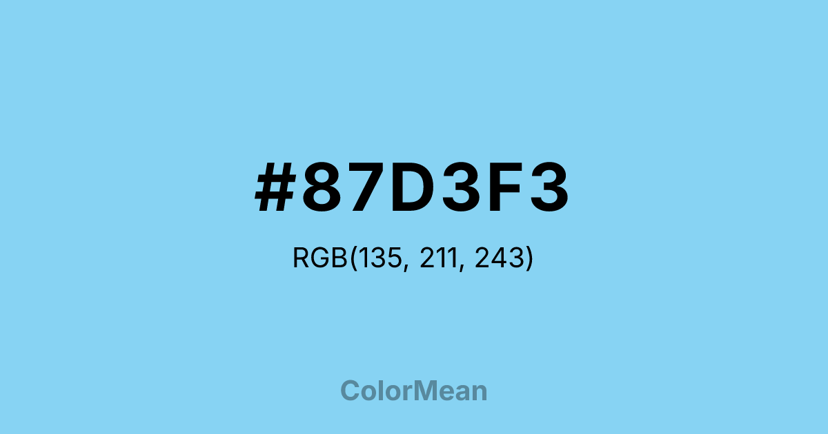 #87D3F3 RGB value is (135, 211, 243). The hex color red value is 135, green is 211, and blue is 243. Its HSL format shows a hue of 198°, saturation of 82 percent, and lightness of 74 percent. The CMYK process values are 44 percent, 13 percent, 0 percent, 5 percent.