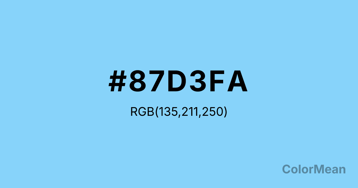 #87D3FA RGB value is (135, 211, 250). The hex color red value is 135, green is 211, and blue is 250. Its HSL format shows a hue of 200°, saturation of 92 percent, and lightness of 75 percent. The CMYK process values are 46 percent, 16 percent, 0 percent, 2 percent.