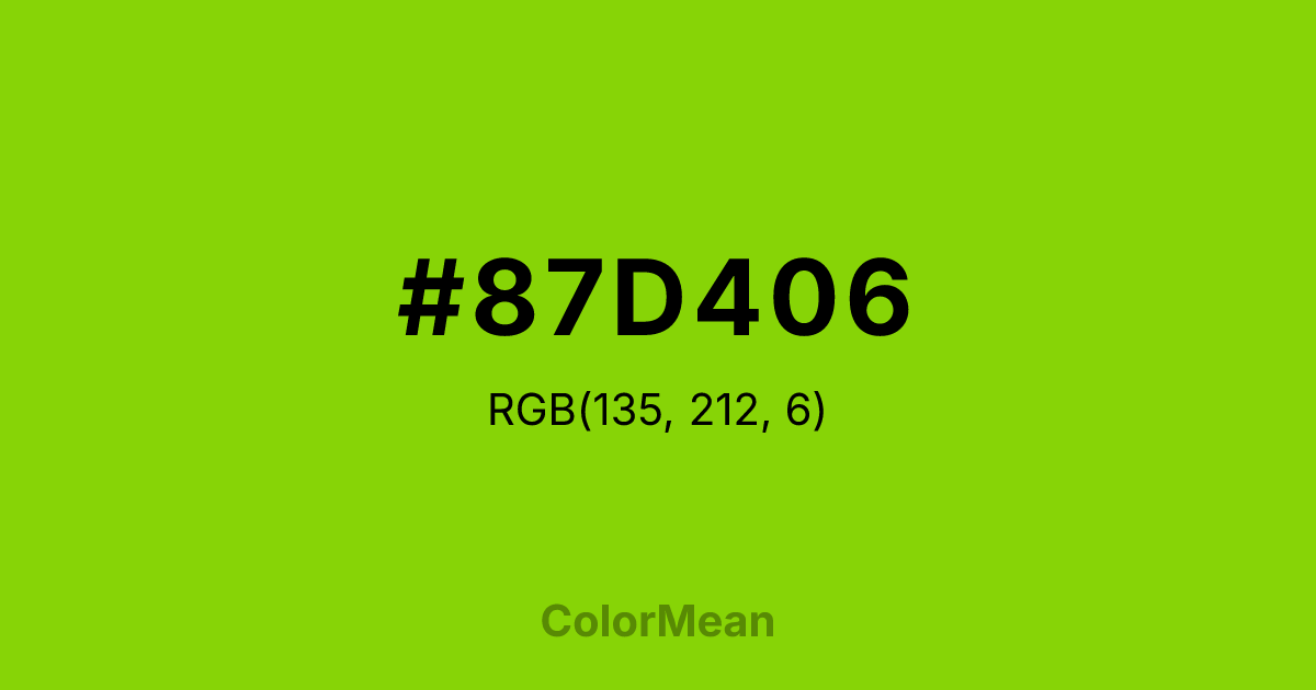 #87D406 RGB value is (135, 212, 6). The hex color red value is 135, green is 212, and blue is 6. Its HSL format shows a hue of 82°, saturation of 94 percent, and lightness of 43 percent. The CMYK process values are 36 percent, 0 percent, 97 percent, 17 percent.