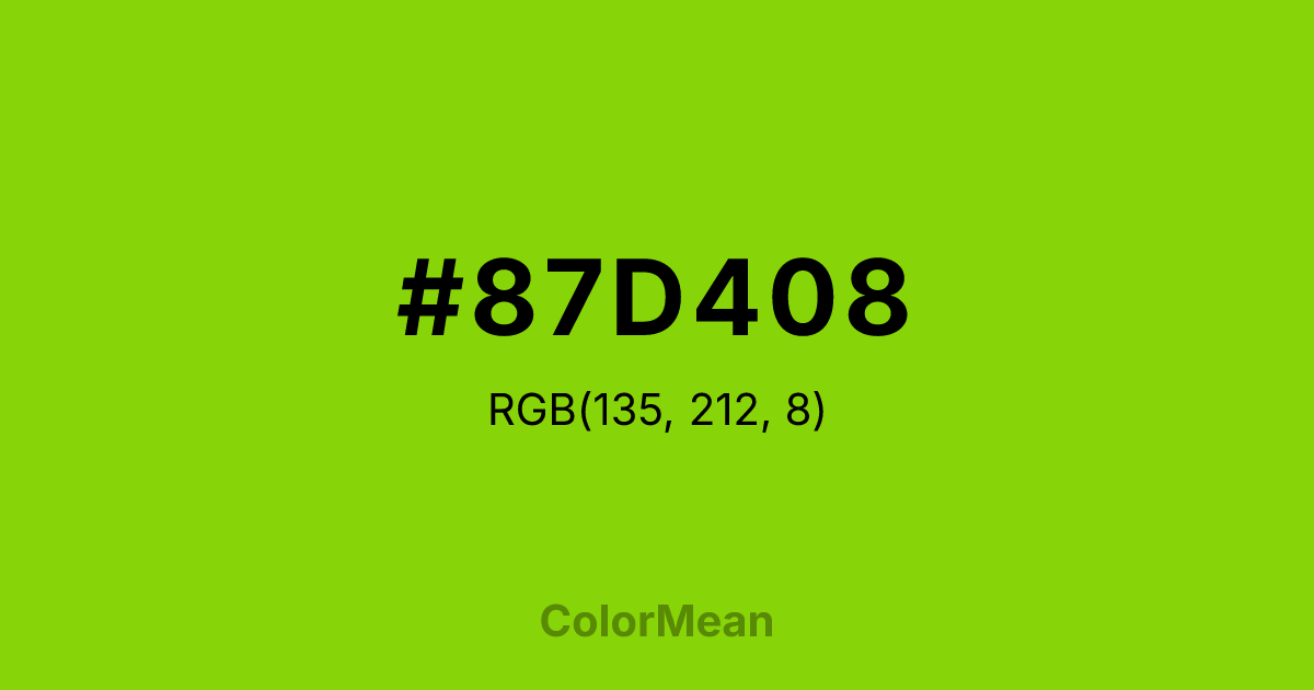 #87D408 RGB value is (135, 212, 8). The hex color red value is 135, green is 212, and blue is 8. Its HSL format shows a hue of 83°, saturation of 93 percent, and lightness of 43 percent. The CMYK process values are 36 percent, 0 percent, 96 percent, 17 percent.