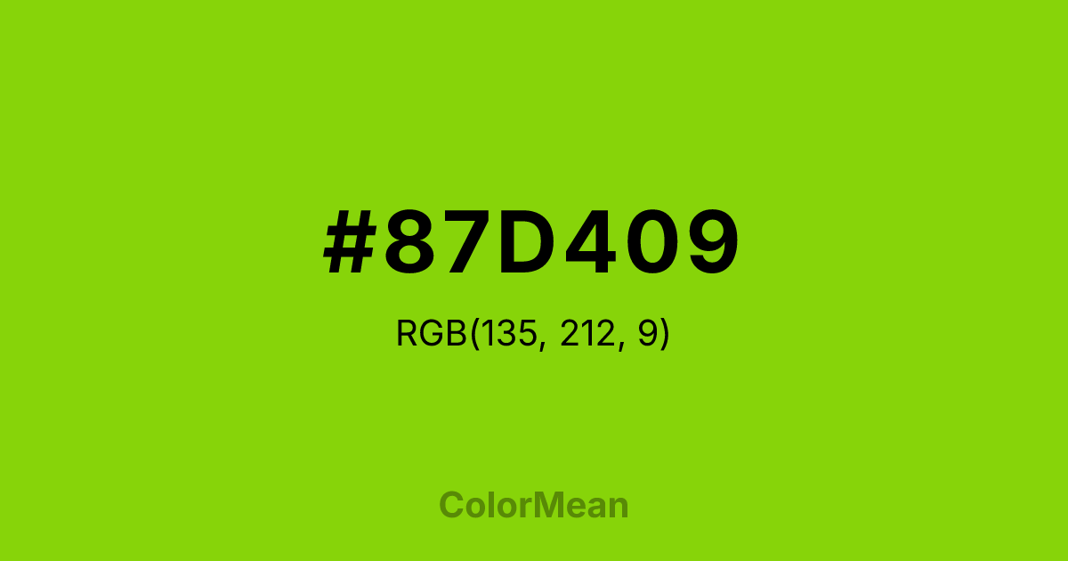 #87D409 RGB value is (135, 212, 9). The hex color red value is 135, green is 212, and blue is 9. Its HSL format shows a hue of 83°, saturation of 92 percent, and lightness of 43 percent. The CMYK process values are 36 percent, 0 percent, 96 percent, 17 percent.