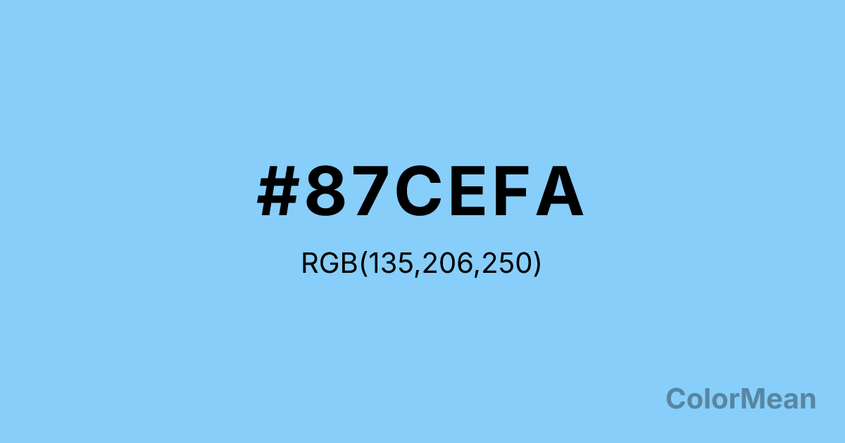 LightskyBlue (#87CEFA) RGB value is (135, 206, 250). The hex color red value is 135, green is 206, and blue is 250. Its HSL format shows a hue of 203°, saturation of 92 percent, and lightness of 75 percent. The CMYK process values are 46 percent, 18 percent, 0 percent, 2 percent.
