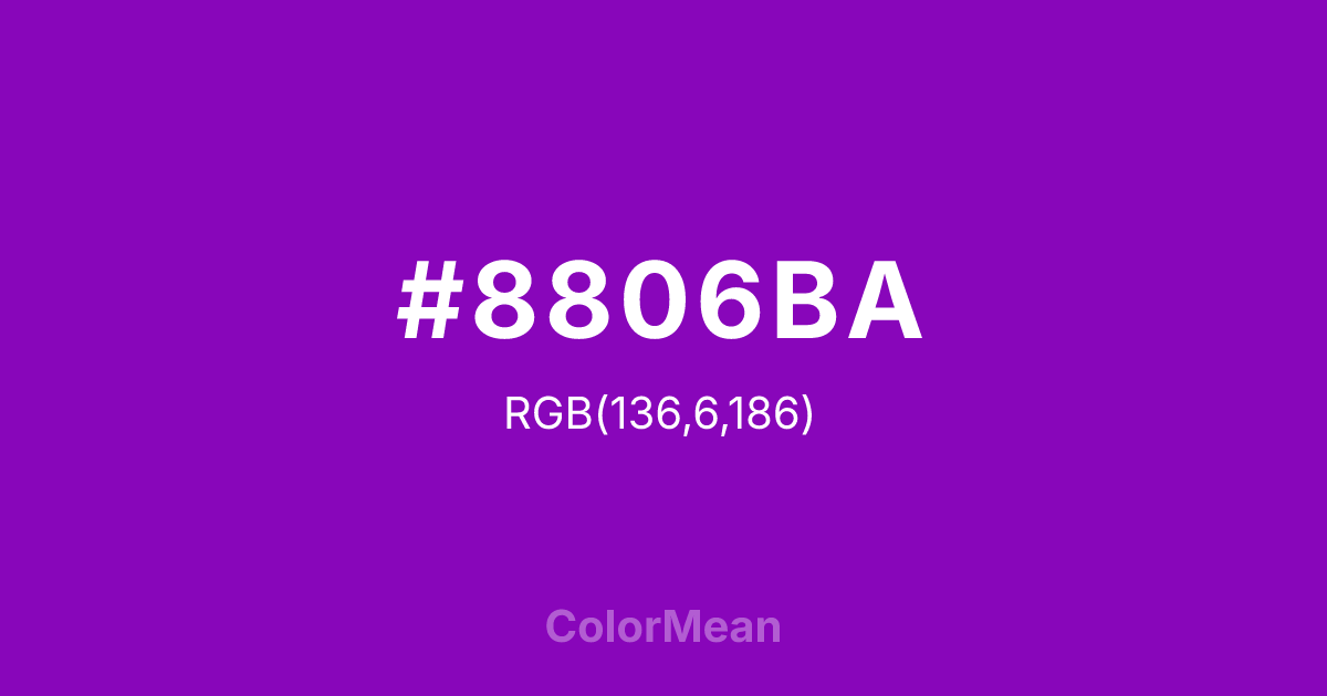 #8806BA RGB value is (136, 6, 186). The hex color red value is 136, green is 6, and blue is 186. Its HSL format shows a hue of 283°, saturation of 94 percent, and lightness of 38 percent. The CMYK process values are 27 percent, 97 percent, 0 percent, 27 percent.