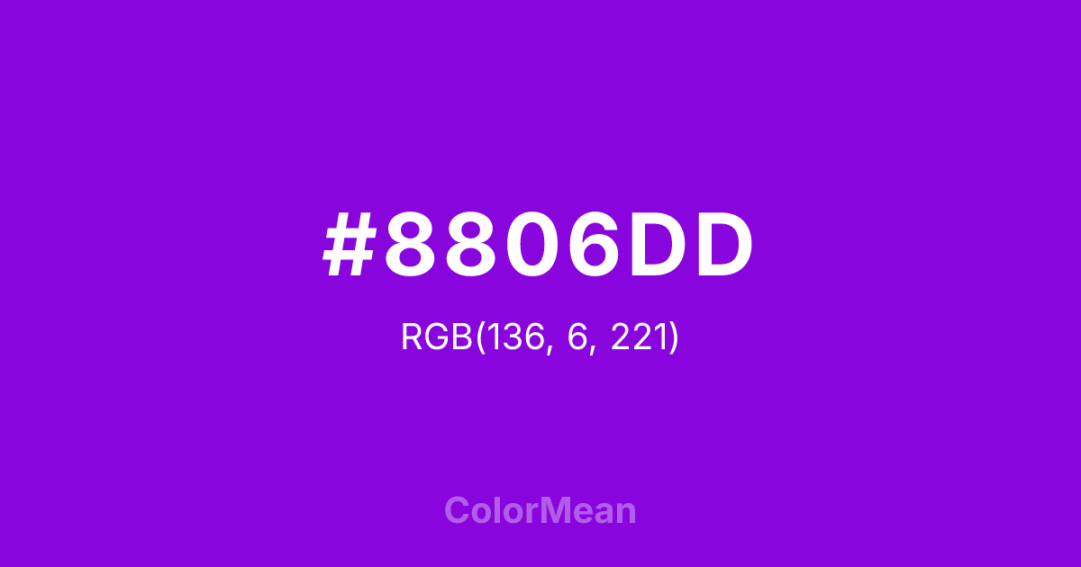 #8806DD RGB value is (136, 6, 221). The hex color red value is 136, green is 6, and blue is 221. Its HSL format shows a hue of 276°, saturation of 95 percent, and lightness of 45 percent. The CMYK process values are 38 percent, 97 percent, 0 percent, 13 percent.