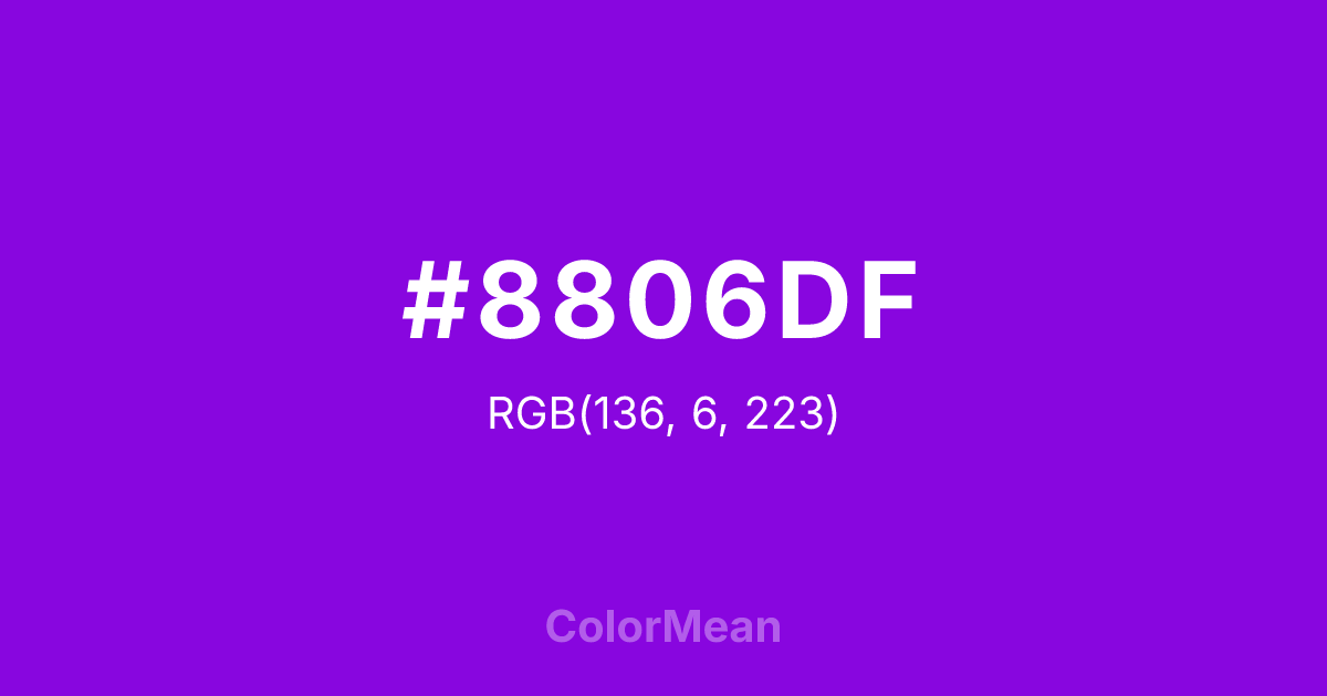 #8806DF RGB value is (136, 6, 223). The hex color red value is 136, green is 6, and blue is 223. Its HSL format shows a hue of 276°, saturation of 95 percent, and lightness of 45 percent. The CMYK process values are 39 percent, 97 percent, 0 percent, 13 percent.