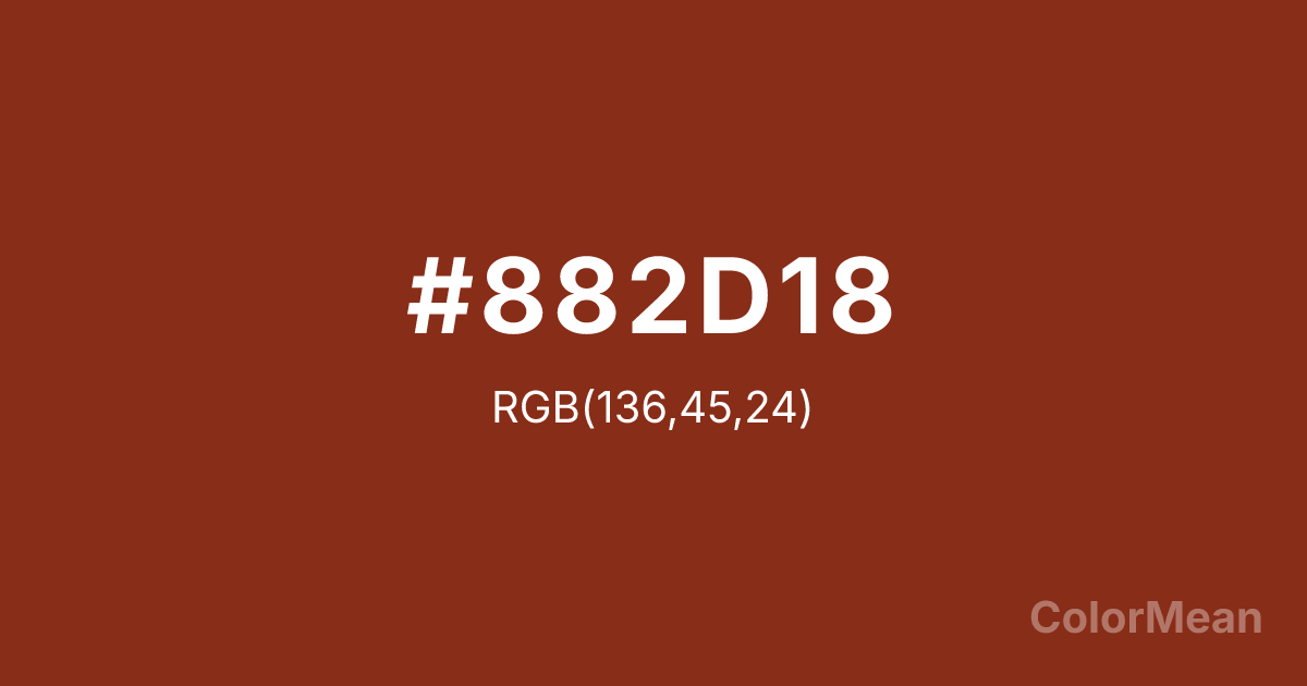 #882D18 RGB value is (136, 45, 24). The hex color red value is 136, green is 45, and blue is 24. Its HSL format shows a hue of 11°, saturation of 70 percent, and lightness of 31 percent. The CMYK process values are 0 percent, 67 percent, 82 percent, 47 percent.