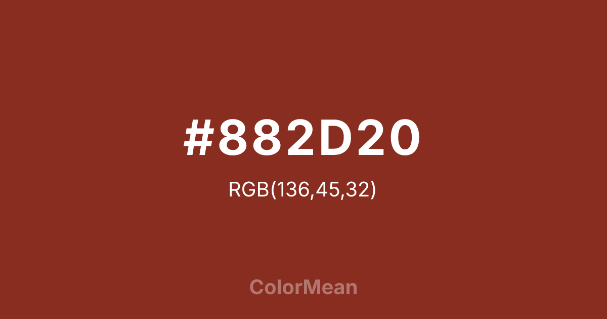 #882D20 RGB value is (136, 45, 32). The hex color red value is 136, green is 45, and blue is 32. Its HSL format shows a hue of 8°, saturation of 62 percent, and lightness of 33 percent. The CMYK process values are 0 percent, 67 percent, 76 percent, 47 percent.