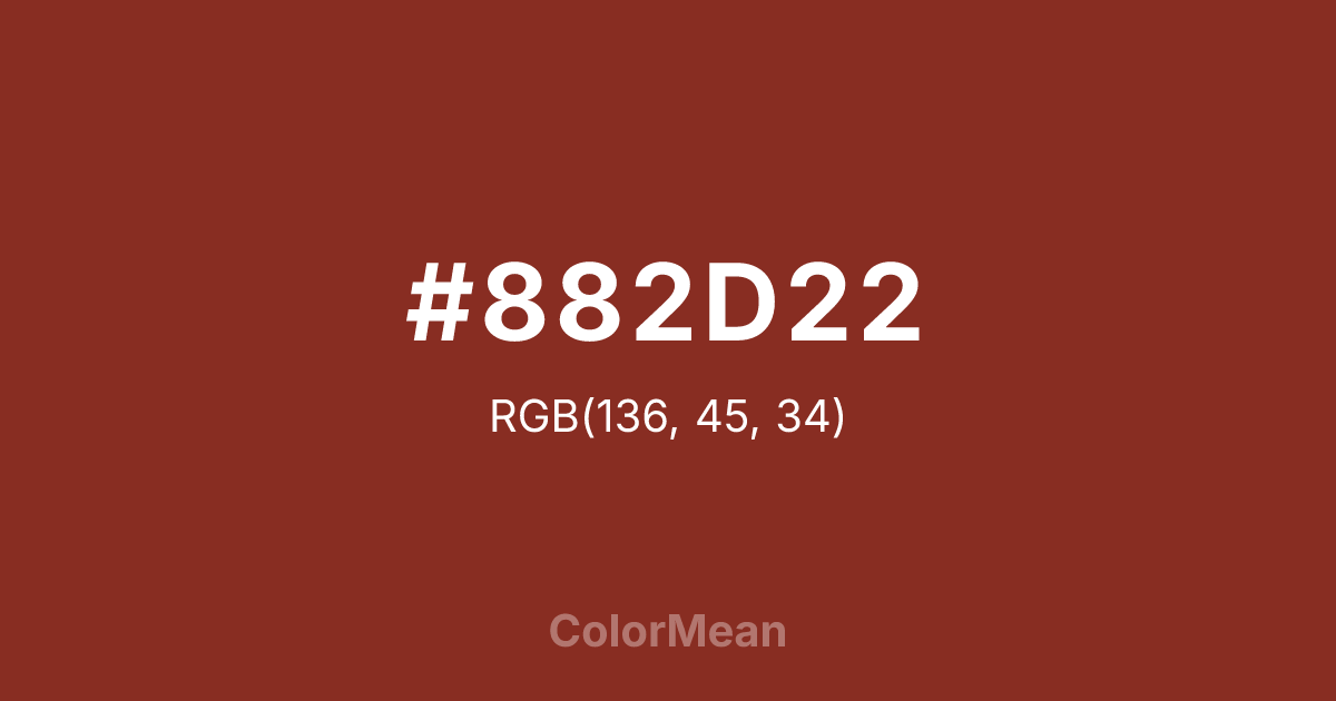 #882D22 RGB value is (136, 45, 34). The hex color red value is 136, green is 45, and blue is 34. Its HSL format shows a hue of 6°, saturation of 60 percent, and lightness of 33 percent. The CMYK process values are 0 percent, 67 percent, 75 percent, 47 percent.
