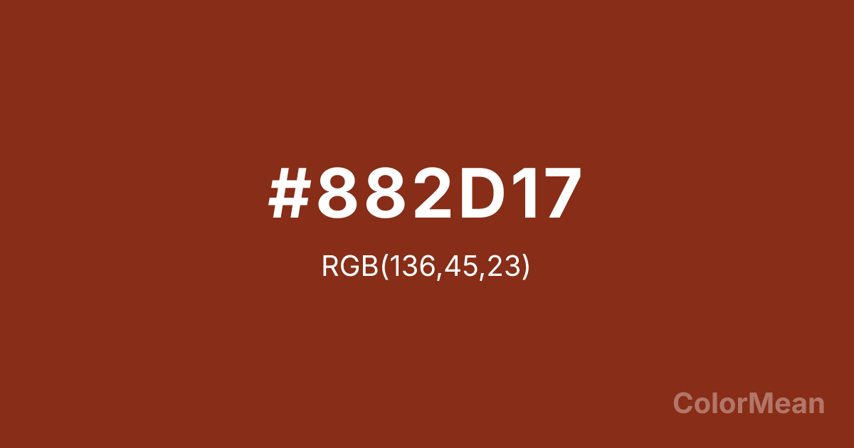 Sienna (#882D17) RGB value is (136, 45, 23). The hex color red value is 136, green is 45, and blue is 23. Its HSL format shows a hue of 12°, saturation of 71 percent, and lightness of 31 percent. The CMYK process values are 0 percent, 67 percent, 83 percent, 47 percent.