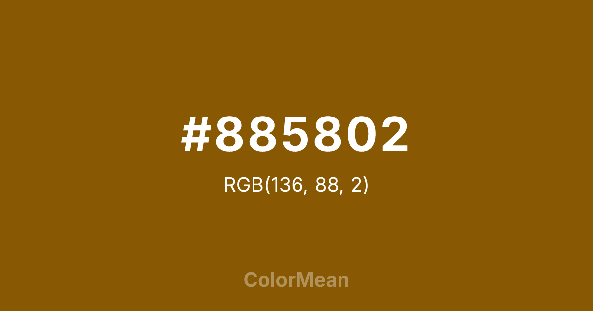 #885802 RGB value is (136, 88, 2). The hex color red value is 136, green is 88, and blue is 2. Its HSL format shows a hue of 39°, saturation of 97 percent, and lightness of 27 percent. The CMYK process values are 0 percent, 35 percent, 99 percent, 47 percent.