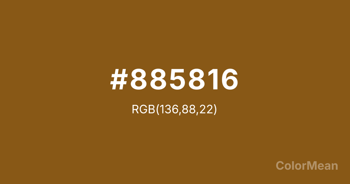 #885816 RGB value is (136, 88, 22). The hex color red value is 136, green is 88, and blue is 22. Its HSL format shows a hue of 35°, saturation of 72 percent, and lightness of 31 percent. The CMYK process values are 0 percent, 35 percent, 84 percent, 47 percent.