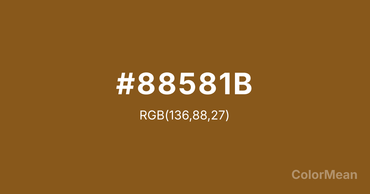 #88581B RGB value is (136, 88, 27). The hex color red value is 136, green is 88, and blue is 27. Its HSL format shows a hue of 34°, saturation of 67 percent, and lightness of 32 percent. The CMYK process values are 0 percent, 35 percent, 80 percent, 47 percent.