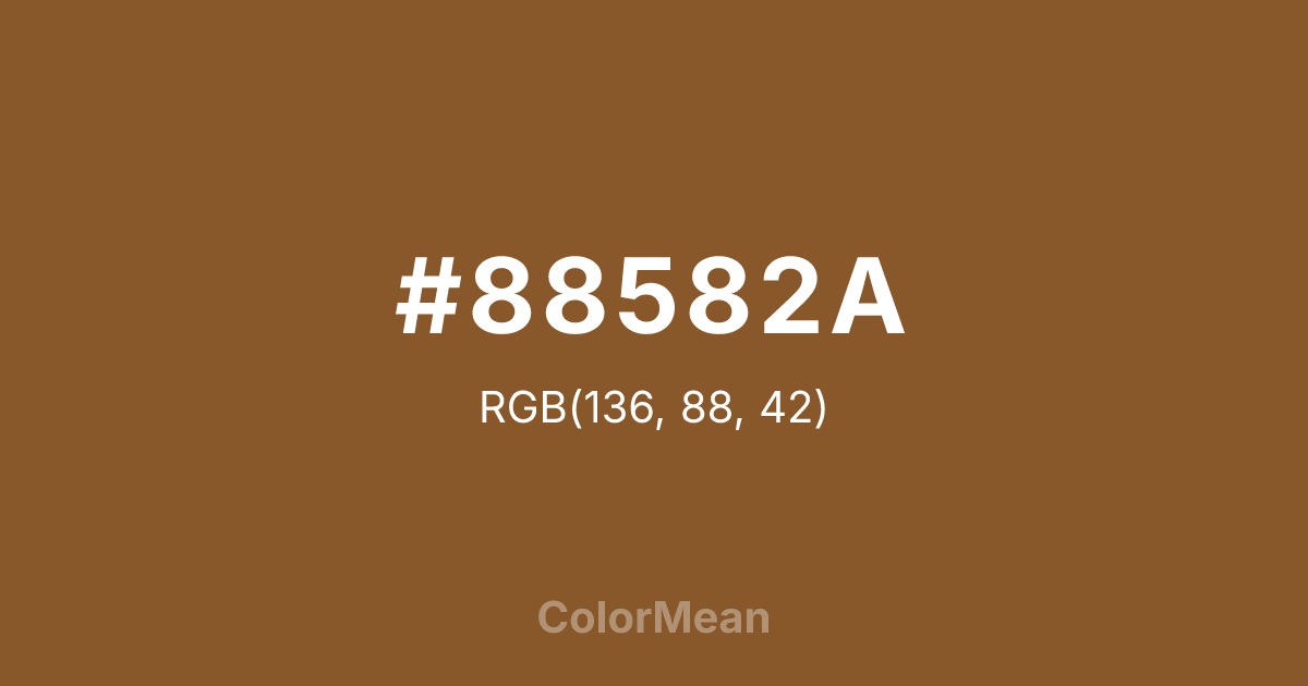 #88582A RGB value is (136, 88, 42). The hex color red value is 136, green is 88, and blue is 42. Its HSL format shows a hue of 29°, saturation of 53 percent, and lightness of 35 percent. The CMYK process values are 0 percent, 35 percent, 69 percent, 47 percent.