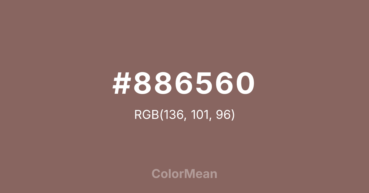 #886560 RGB value is (136, 101, 96). The hex color red value is 136, green is 101, and blue is 96. Its HSL format shows a hue of 7°, saturation of 17 percent, and lightness of 45 percent. The CMYK process values are 0 percent, 26 percent, 29 percent, 47 percent.