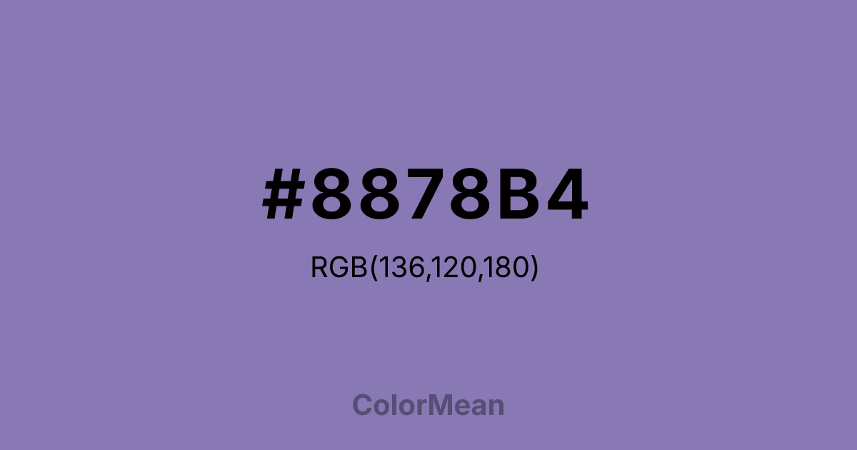 #8878B4 RGB value is (136, 120, 180). The hex color red value is 136, green is 120, and blue is 180. Its HSL format shows a hue of 256°, saturation of 29 percent, and lightness of 59 percent. The CMYK process values are 24 percent, 33 percent, 0 percent, 29 percent.