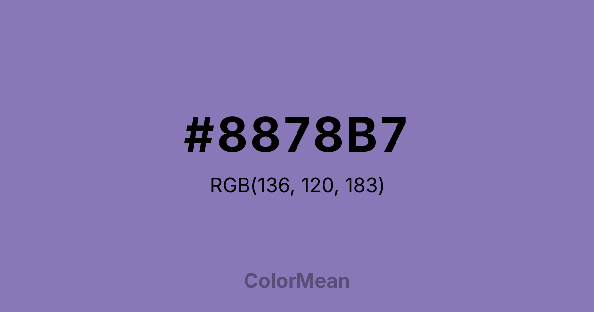 #8878B7 RGB value is (136, 120, 183). The hex color red value is 136, green is 120, and blue is 183. Its HSL format shows a hue of 255°, saturation of 30 percent, and lightness of 59 percent. The CMYK process values are 26 percent, 34 percent, 0 percent, 28 percent.