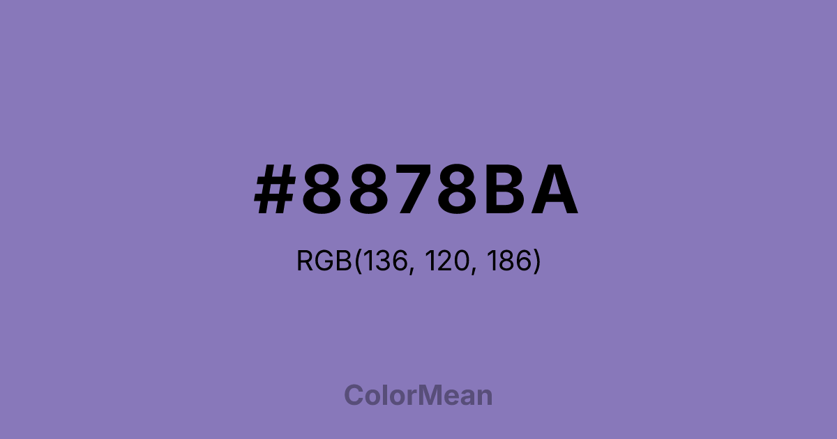 #8878BA RGB value is (136, 120, 186). The hex color red value is 136, green is 120, and blue is 186. Its HSL format shows a hue of 255°, saturation of 32 percent, and lightness of 60 percent. The CMYK process values are 27 percent, 35 percent, 0 percent, 27 percent.