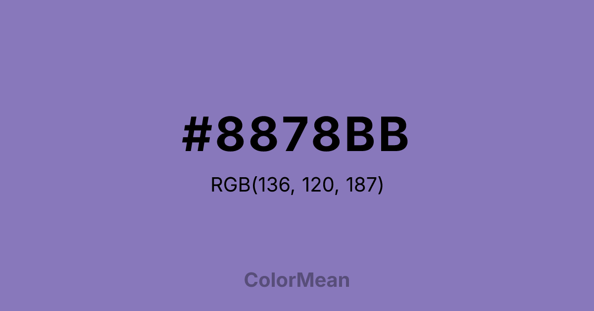 #8878BB RGB value is (136, 120, 187). The hex color red value is 136, green is 120, and blue is 187. Its HSL format shows a hue of 254°, saturation of 33 percent, and lightness of 60 percent. The CMYK process values are 27 percent, 36 percent, 0 percent, 27 percent.