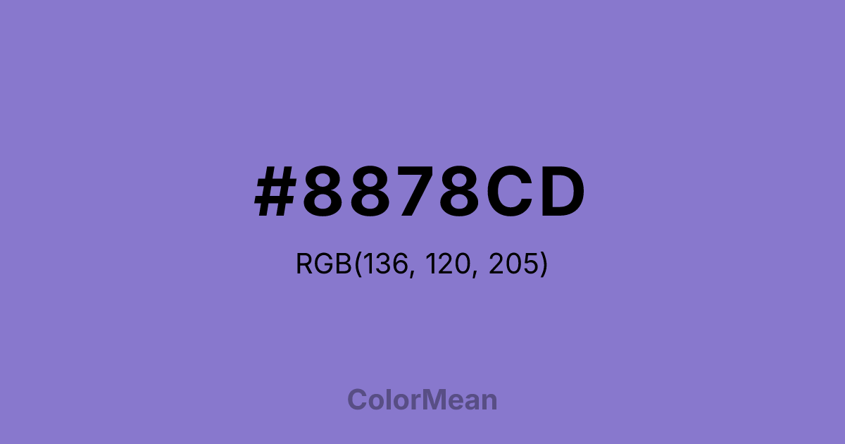 #8878CD RGB value is (136, 120, 205). The hex color red value is 136, green is 120, and blue is 205. Its HSL format shows a hue of 251°, saturation of 46 percent, and lightness of 64 percent. The CMYK process values are 34 percent, 41 percent, 0 percent, 20 percent.
