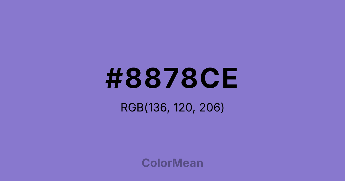 #8878CE RGB value is (136, 120, 206). The hex color red value is 136, green is 120, and blue is 206. Its HSL format shows a hue of 251°, saturation of 47 percent, and lightness of 64 percent. The CMYK process values are 34 percent, 42 percent, 0 percent, 19 percent.