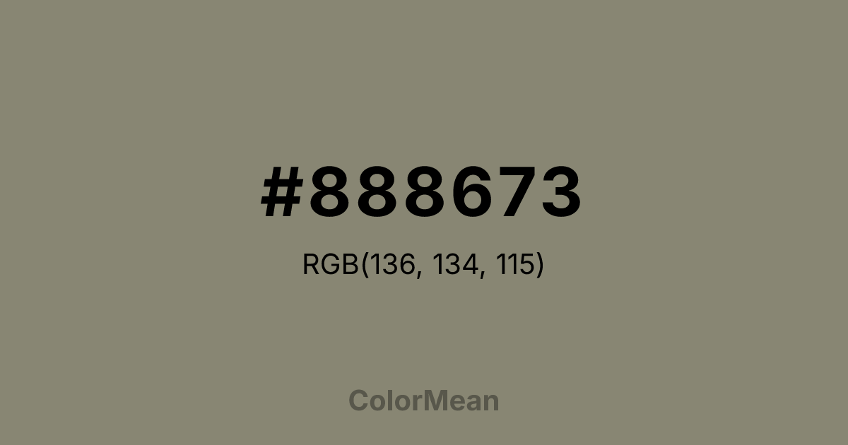 #888673 RGB value is (136, 134, 115). The hex color red value is 136, green is 134, and blue is 115. Its HSL format shows a hue of 54°, saturation of 8 percent, and lightness of 49 percent. The CMYK process values are 0 percent, 1 percent, 15 percent, 47 percent.